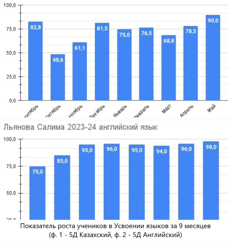 9개월간 학생의 언어습득 성장 지표(1~5D 카자흐어, 2~5D 영어)