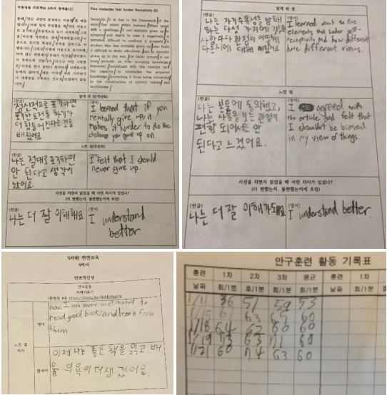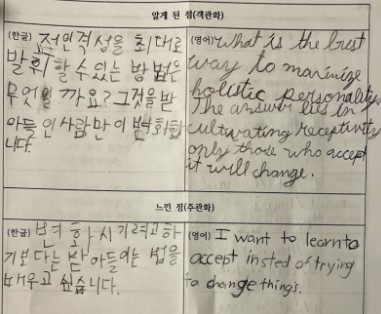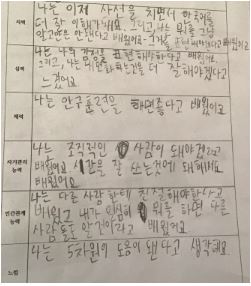 1학기 3개월 동안은 5가지 요소를 함께 훈련하면서 지력에서는 한국어를 익히고 표현하는 부분에 조금 더 비중이 주어져 있었다. 2학기의 지력은 조금 더 심화된 과정으로 진행된다. 1학기를 마치며 함께 공부한 3개월 동안 5차원 전면교육의 지력, 심력, 체력, 자기관리 능력, 인간관계 능력 등에서 변화의 여부와 정도를 스스로 어떻게 인식하고 있는지 정리해 보도록 하였다. 아이들이 정리한 페이퍼이다.