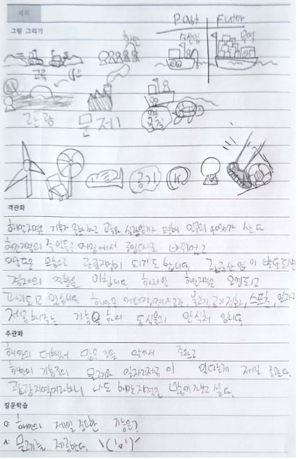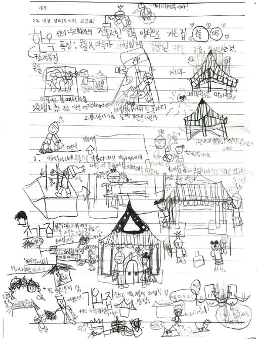 HJ는 한옥에 대해 읽고 적극적으로 그림을 그리며 정리했다. 아이는 한옥에 대한 특성이나 구조를 생각하면서 그림을 그렸을 것이다. 이런 활동은 학생이 시간적으로 여유 있기 때문에 가능하다. 늘 시간에 쫓기는 아이라면 이런 과정을 즐기며 하지 못할 뿐더러 하지도 않을 것이다. 여유 있게 공부하는 즐거움이 있으니 HJ는 표정이 늘 밝은 게 아닌가 한다. HJ는 독서를 많이 하는 학생이지만 과학 쪽은 많이 읽지 않았다고 한다. 이 수업을 통해 과학이 재미있게 느껴진다고 하니 수업하는 기쁨이 있다.
