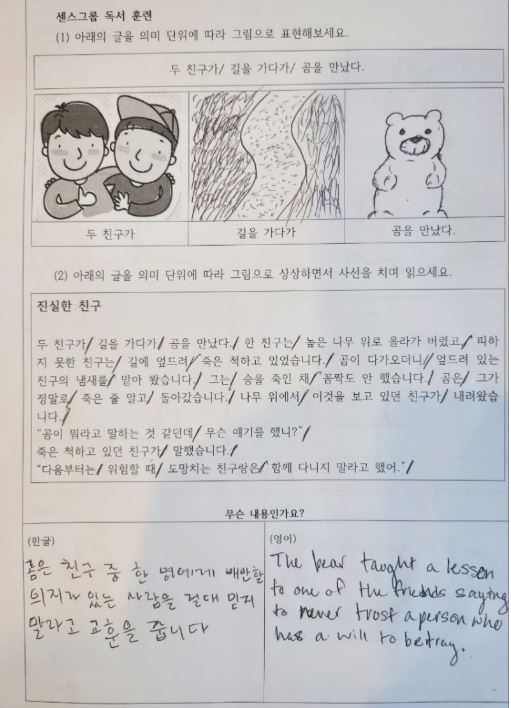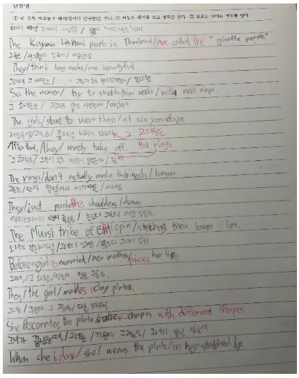 미국 학생들과 2차시 수업부터 사선치기를 시작했다. 사선치며 읽는 것이 익숙해지면 이해도가 높으며 읽는 속도 또한 빨라진다. 사선을 치며 읽으면 말이나 글로 표출되기 전에 읽는 과정에서도 아이의 이해 정도를 알 수 있다. 학생들이 처음에 사선치며 읽는 것에 대해 부정적인 생각을 갖기 쉽기 때문에 처음 사선치며 읽을 때 예전의 읽는 방법과 어떻게 다른지 비교해 느낌을 쓰게 한다.
