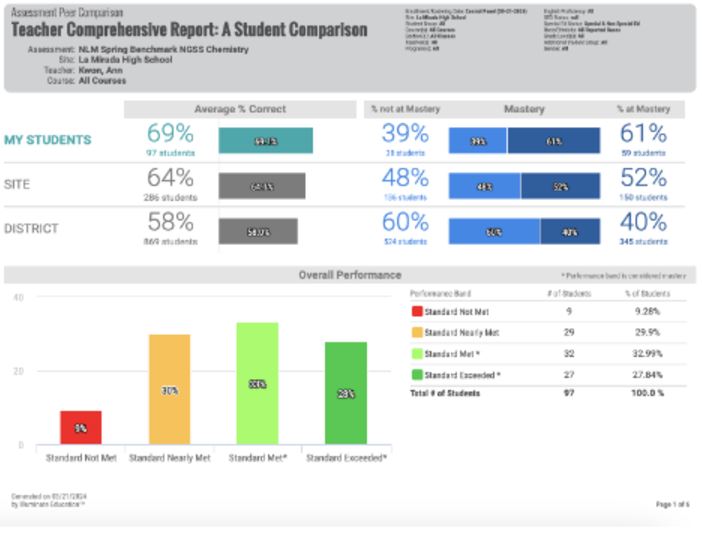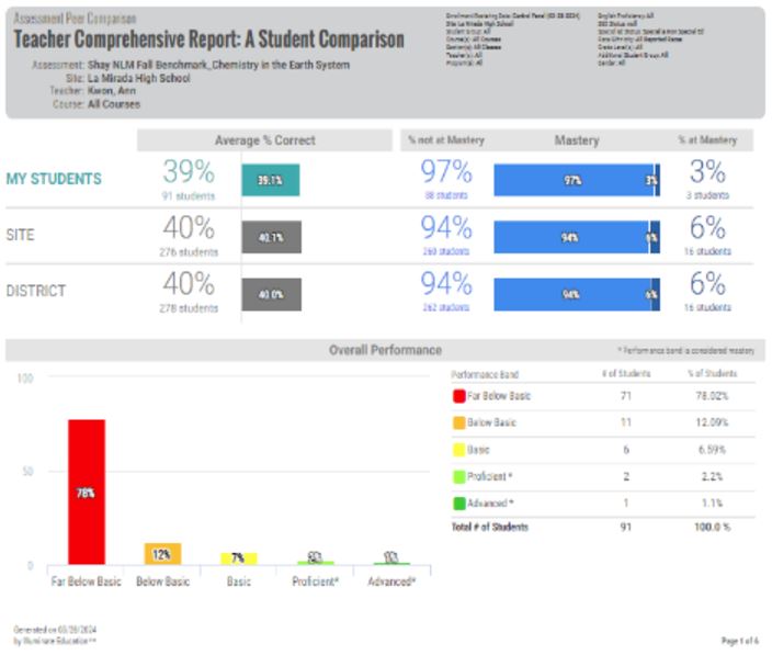 2024년 봄 학기, 노워크-라 미라다 통합교육구에 속한 세 개 고등학교의 주 시험 결과. 시험 과목은 지구 시스템에서의 화학입니다.